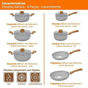O Conjunto de Panelas Sahara Grey 8 peças possui revestimento antiaderente em cerâmica e 2,0mm espessura em sua estrutura, o que melhora o preparo de seus alimentos, pois a temperatura é dissipada de maneira uniforme e favorece o cozimento, evitando que sua comida queime facilmente.