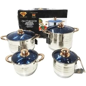 23 peças 9 camadas de cerâmica em aço cirúrgico 18/10 gramaturata termosto 2 Frigideiras 4 Panelas 1 Fritadeira 5 Tampas 6 Colheres 1 Grau de fritadeira 1 Avental 2 Dois puxador 1 Porta panela