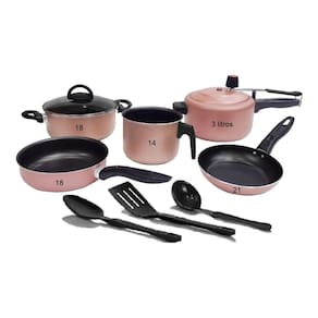 Com antiaderente de alta qualidade, ele agiliza o cozimento dos alimentos, além de maior praticidade na limpeza.As tampas de vidro ajudam a visualizar o preparo dos alimentos.Os utensílios de Nylon proporcionam maior praticidade e preservam a qualidade do antiaderente garantido maior durabilidade às panelas.A tampa da panela pode ser usada na frigideira funda para facilitar na fritura.A panela de pressão de 3 litros é do tamanho ideal para uso diário. Além de bonita e prática é muito segura e tem aprovação e certificado da Inmetro.O Conjunto é composto por:01 Caçarola diametro 18 cm01 Panela de Pressão de 3 litros01 Fervedor diametro 14 cm01 Frigideira diametro 18 cm01 Frigideira Francesa 21 cm01 Espátula de Nylon01 Colher de Nylon01 Concha de Nylon