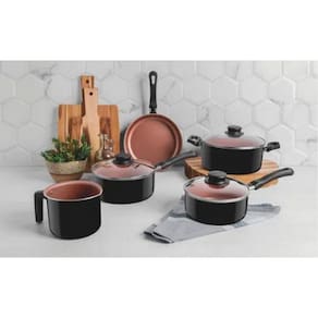 Informações Gerais Corpo de alumínio com espessura que proporciona cozimento rápido e uniforme. Revestimento interno de antiaderente Starflon Max que não gruda, é fácil de limpar, mais durável e não é prejudicial à saúde, pois é livre de PFOA. Revestimento externo de poliéster. Tampas de vidro temperado com borda de aço inox. Cabos, alças de baquelite antitérmico e pegadores de nylon que oferecem segurança durante o manuseio.