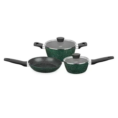 Características do Produto: Marca: MTA Modelo: Carmela Garden Quantidade de peças:3 Com revestimento antiaderente: Sim É adequado para lava-louças: Sim Materiais: Corpo: Alumínio, Revestimento antiaderente cerâmic-flon, Tampas de vidro temperado, cabos e alças revestidos com Soft-Touch Peças incluídas: 1 Panela, 1 Caçarola e 1 Frigideira.