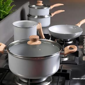 O conjunto de panelas Ceramic Life Easy 5 peças brinox smart plus ceramic life é um jogo de utensílios domésticos que oferece durabilidade, beleza e praticidade hora de cozinhar. As panelas são feitas de alumínio com revestimento cerâmico antiaderente, que não libera metais pesados e elementos químicos no alimento. Elas também possuem tampas de vidro temperado com saída de vapor e alças e cabos em soft-touch antitérmico, que não esquentam e garantem um manuseio seguro e confortável. Além disso, elas são resistentes a altas temperaturas e podem ser usadas em fogões a gás, elétricos e vitrocerâmicos.