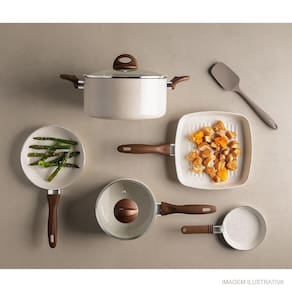 Conteúdo da embalagem - 01 Panela com Tampa Ø16 x 8 cm - 1,25L - 01 Panela com Tampa Ø18 x 9 cm - 1,55L - 01 Caçarola com Tampa Ø20 x 9,5 cm - 2,55L - 01 Caçarola com Tampa Ø24 x 11,5 cm - 4,55L - 01 Frigideira Ø14 x 2,5 cm - 0,2L - 01 Frigideira Ø20 x 3,5 cm - 0,6L - 01 Grill 24 x 22 x 3 cm - 1,35L - 01 Fervedor Ø11 x 12,5 cm - 1L