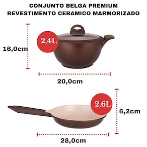 Conjunto de Panelas Cooktop Indução Antiaderente Belga MTA Estilo, qualidade e modernidade na cozinha. A linha Belga 5 mm com técnologia antiaderente Cerâmic-Flon traz personalidade para a sua cozinha. Altamente resistentes, livres de metais pesados e elementos químicos prejudiciais à saúde, exigem menos uso de óleo e sua limpeza é extremamente fácil. A linha Belga ajuda a manter sua alimentação saudável e prática. As tampas em vidro temperado possuem saída para o vapor permitindo que você acompanhe o preparo das suas receitas, os cabos e alças possuem revestimento Soft-Touch que não esquenta durante o uso e seu toque seja confortável e seguro. Suas alças são removíveis, permitindo ainda que o produto vá ao forno. Uma caçarola que vira forma para bolo Temos Modernidade e sofisticação na cozinha, definem a linha Belga.- Fundo para Eletroindução, sistema que aquece mais rápido.- Cerâmico.- Elétrico.- Halogênio.- Gás. Composição: 02 Caçarola nr. 20 de 2,4 litros02 Caçarola nr. 24 de 4,3 litros02 Frigideira nr. 24 de 1,7 litros Instruções de uso: - Antes de usar, lave e enxugue a suas panelas por completo.- Não coloque a peça vazia para aquecer.- Ao utilizar a peça em fogão a gás, a chama não deve ultrapassar a base, em fogões elétricos ou vitro-cerâmicos, o diametro da boca deverá ser igual ou inferior ao do fundo da peça. Isso evita que o alimento queime. Limpeza e conservação: - Para manter o brilho da seu jogo belga, lave somente com uma esponja macia, detergente ou sabão neutro. Não use lã de aço ou outros abrasivos- Para mexer ou retirar os alimentos use utensilios de silicone, nylon, polipropileno ou madeira. Não use objeatos pontiagudos, não raspe e não corte o alimento dentro da peça, para não riscar.- Evite água com excesso de cloro, para evitar manchas.- Deixe a peça esfriar antes de lavar em água fria. Isso facilita a limpeza- Caso a comida quieime, deixe a peça esfriar e coloque-a de molho em água por alguns minutos antes de lavar.