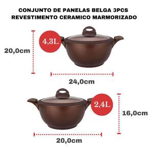 Conjunto de Panelas Cooktop Indução Antiaderente Belga MTA Estilo, qualidade e modernidade na cozinha. A linha Belga 5 mm com técnologia antiaderente Cerâmic-Flon traz personalidade para a sua cozinha. Altamente resistentes, livres de metais pesados e elementos químicos prejudiciais à saúde, exigem menos uso de óleo e sua limpeza é extremamente fácil. A linha Belga ajuda a manter sua alimentação saudável e prática. As tampas em vidro temperado possuem saída para o vapor permitindo que você acompanhe o preparo das suas receitas, os cabos e alças possuem revestimento Soft-Touch que não esquenta durante o uso e seu toque seja confortável e seguro. Suas alças são removíveis, permitindo ainda que o produto vá ao forno. Uma caçarola que vira forma para bolo Temos Modernidade e sofisticação na cozinha, definem a linha Belga.- Fundo para Eletroindução, sistema que aquece mais rápido.- Cerâmico.- Elétrico.- Halogênio.- Gás. Composição: 02 Caçarola nr. 20 de 2,4 litros02 Caçarola nr. 24 de 4,3 litros02 Frigideira nr. 24 de 1,7 litros Instruções de uso: - Antes de usar, lave e enxugue a suas panelas por completo.- Não coloque a peça vazia para aquecer.- Ao utilizar a peça em fogão a gás, a chama não deve ultrapassar a base, em fogões elétricos ou vitro-cerâmicos, o diametro da boca deverá ser igual ou inferior ao do fundo da peça. Isso evita que o alimento queime. Limpeza e conservação: - Para manter o brilho da seu jogo belga, lave somente com uma esponja macia, detergente ou sabão neutro. Não use lã de aço ou outros abrasivos- Para mexer ou retirar os alimentos use utensilios de silicone, nylon, polipropileno ou madeira. Não use objeatos pontiagudos, não raspe e não corte o alimento dentro da peça, para não riscar.- Evite água com excesso de cloro, para evitar manchas.- Deixe a peça esfriar antes de lavar em água fria. Isso facilita a limpeza- Caso a comida quieime, deixe a peça esfriar e coloque-a de molho em água por alguns minutos antes de lavar.