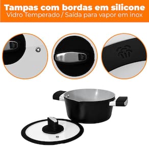 As tampas com borda de silicone proporcionam vedação eficiente e silenciosa, enquanto os cabos em baquelite soft-touch oferecem manuseio confortável mesmo com o uso contínuo. Um dos diferenciais está nos bicos dosadores presentes em todas as panelas, que facilitam o despejo de líquidos com controle total, sem bagunça.