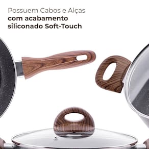Os Cabos são em baquelite siliconado soft-touch com efeito amadeirado, o que evitará que esquentem durante o preparo de seus alimentos, e as tampas são feitas de vidro temperado com saídas para vapor e bordas em inox, ideais para você que gosta de sofisticação e elegância em sua cozinha.