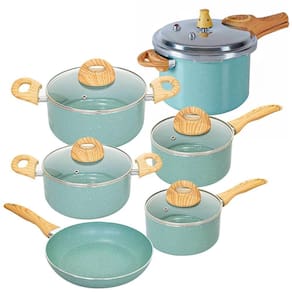 O jogo de panelas possui design inovador, produzida na cor verde com cabos amadeirados, o que com certeza é um diferencial quando estão expostas.
