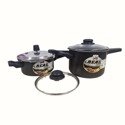 Conjunto de Panela de Pressão com fechamento externo e tampa de vidro temperado. Esse kit é ideal para realizar as receitas e não deixá-las esfriar na mesa.