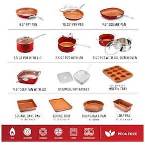 Cozinha completa em uma caixa inclui um conjunto completo de frigideiras, panelas de caldo, panelas de molho, assadeiras, panelas a vapor e muito mais. Premiado revestimento Ti Cerama Garante a liberação final tudo simplesmente desliza para fora da panela, sem necessidade de óleo ou manteiga. Ultradurável à prova de arranhões e para utensílios de metal. Observação este produto pode chegar na embalagem de varejo ou em uma caixa ecológica reciclável. Design leve proporciona uma experiência de cozimento confortável. Forno até 260C As panelas e frigideiras são adequadas para todos os fogões, exceto indução. Pode ser lavado na lava louças Facilita a limpeza sem esforço