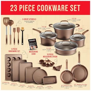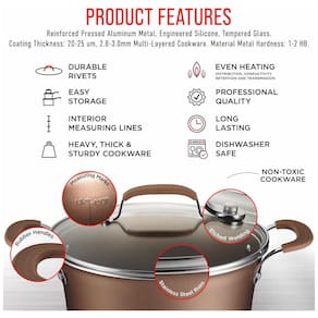 CONJUNTO DE UTENSÍLIOS DE COZINHA atualize seus utensílios de cozinha existentes para nossos utensílios de cozinha domésticos profissionais, que apresentam 23 itens maciços Tudo o que você precisa para criar refeições de primeira classe está incluído. Todo o nosso conjunto de panelas e frigideiras tem um revestimento antiaderente durável e de longa duração, bem como alças confortáveis e frescas ao toque para sua conveniência. Feito de metal de alumínio prensado reforçado, eles são o conjunto de cozinha obrigatório para sua casa ADEQUADO PARA O SEU BALCÃO DE COZINHA projetamos nossos utensílios de cozinha para serem compatíveis com fogões a gás, elétricos, cerâmicos e de indução. Nosso conjunto de panelas é para alimentos e adequado para todas as habilidades e foi projetado para distribuir e reter o calor de forma eficaz para cozinhar uniformemente. Com um padrão de onda xadrez integrado para superfícies antiaderentes excepcionais em todas as panelas. POTES E PANELAS com dois potes de molho, um pote de forno holandês e fogão jumbo incluído, você pode ferver, grelhar e ferver uma variedade de alimentos até uma temperatura máxima de 500 Fahrenheit 260 Celsius. Todos os nossos potes vêm com tampas de vidro temperado transparente para maior versatilidade e medidas dentro dos potes para maior comodidade. Também estão incluídos uma frigideira pequena e uma frigideira média para ovos, panquecas e muito mais UTENSÍLIOS INCLUÍDOS queremos que você tenha tudo o que precisa para assar, assar e preparar deliciosas refeições e lanches, por isso incluímos também utensílios de cozinha resistentes ao calor com nosso conjunto de panelas. A concha de sopa, espátula, pincel e colheres medidoras são feitas de silicone de engenharia e todas combinam com o design das panelas e frigideiras para que você possa desfrutar de panelas modernas em sua cozinha. TECNOLOGIA DE LONGA DURAÇÃO nossas panelas e frigideiras e utensílios de cozinha são todos resistentes a manchas e fáceis de limpar. Eles podem ser lavados na máquina de lavar louça, mas recomendamos lavar à mão para obter melhores resultados. A construção ecologicamente correta, a escolha elegante de cores e a extensa coleção de itens tornam esta panela de indução versátil para iniciantes e especialistas. É uma ótima ideia de presente para quem está começando na primeira casa, recém casados ou para amigos e parentes que adoram cozinhar
