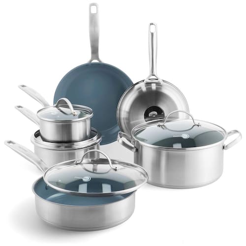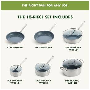 Este conjunto inclui 8 e 10 frigideiras, caçarolas de 0,93 litros e 1,87 litros com tampa, frigideira de 2,80 litros com tampa, caldeirão de 4,66 litros com tampa e esponja Renew. Seguro para utensílios de metal, o revestimento antiaderente autêntico da GreenPans com infusão de diamante oferece durabilidade notável, aquecimento equilibrado e limpeza sem esforço. O revestimento antiaderente de cerâmica saudável GreenPans Thermolon TOXINFREE é livre de PFAS, PFOA, grafite e cádmio para refeições sem preocupações. A construção ultrarresistente e a base encapsulada proporcionam excelente transferência de calor e durabilidade duradoura.