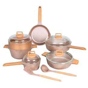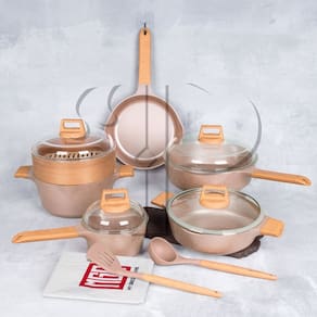 Jogo de Panelas - Revestimento Granito - 13 Peças Antiaderente Granito. Designe moderno e elegante Espessura 6mm Não Mancham, Não Descascam e Não Soltam Resíduos. Totalmente Atóxicas Conjunto composto por 1 Frigideira, 2 Panela + 2 tampa, 2 Caçarolas + 2 tampas +1 cozi evapore + 2 utensílios + 1 Avental.