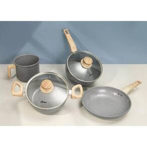 ESPECIFICAÇÕES - Linha: Marble Edition Revestimento em biocerâmica. - Cor: Cream Acabamento Marmorizado. - Cabos revestidos em silicone na cor madeira. - Quantidade de Peças: 4 - Espessura: 5.5mm - Compatibilidade: Fogão à gás, indução, halógeno, elétrico e vitrocerâmico. - Marca: OSTER