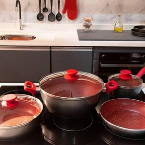 O Conjunto de Panelas Philco Redstone PKT407, composto por 4 peças, se destaca pelo revestimento cerâmico de alto poder antiaderente Redstone. Essa característica permite preparar alimentos sem grudar, tornando a limpeza mais fácil. Além disso, as panelas são versáteis e compatíveis com todos os tipos de fogões, como elétricos, a gás, radiante, indução e vitrocerâmicos. O cabo de baquelite, revestido com material emborrachado, proporciona segurança ao cozinhar, evitando queimaduras nas mãos. A espessura do fundo, de 4,5mm, contribui para uma distribuição mais eficiente e rápida do calor, mantendo a temperatura por mais tempo. Com espessura de 3,5mm, as panelas garantem durabilidade excepcional ao produto. Experimente a qualidade e praticidade do Conjunto de Panelas Philco Redstone PKT407 em sua cozinha.