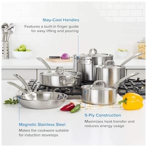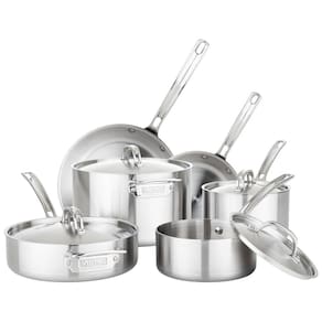 Conjunto inclui frigideiras de e , panelas de molho de 2 L e 3 L com tampas, panela de estoque de 8 L com tampa e panela refogada de 3,4 litros com tampa. Este conjunto de panelas e frigideiras de cozinha apresenta um exterior de aço inoxidável. Com um elegante acabamento acetinado e cinco camadas de metal, esta linha premium de panelas de cozinha é especialmente feita à mão nos EUA. Estas panelas e frigideiras de indução são exatamente o que falta na sua cozinha. 5 Ply Professional é otimizado para todos os cooktops, incluindo indução. Alças ergonômicas em aço fundido para conforto, equilíbrio e controle. Fogão, forno, grelha, grill e lava louças. As panelas de aço inoxidável Viking estão disponíveis em 3 ou 5 camadas e apresentam panelas e frigideiras de indução perfeitas para cada conjunto de cozinha. Estas panelas para cozinhar são um ótimo complemento para suas panelas e frigideiras. De panelas de alta qualidade fabricadas nos EUA a peças de ferro fundido ou panelas antiaderentes, a Viking tem algo para você. Explore aço inoxidável, alumínio antiaderente, cobre, titânio, ferro fundido, aço carbono e muito mais
