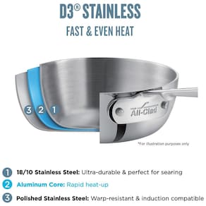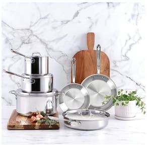 O conjunto inclui frigideiras de 20 e , panela de molho de 2 litros com tampa, caçarola de 3 litros com tampa, frigideira de 3 litros com tampa e panela de 8 litros com tampa Construção clássica de três camadas, feita com um núcleo de alumínio responsivo unido com 2 camadas de aço inoxidável durável em toda a volta para máxima durabilidade e distribuição de calor rápida e uniforme Protegido com alças de aço inoxidável rebitadas para garantir uma aderência segura e adicionar um pouco de estilo com tampas de aço inoxidável para combinar Compatível com todos os cooktops, incluindo indução, e para forno e frangos de corte até 315 C