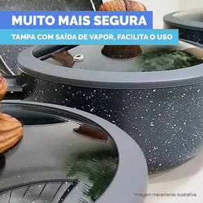 As peças do conjunto possuem cabos e alças com acabamento siliconado Soft-Touch com efeito amadeirado, que dão um toque macio e não esquentam, evitando acidentes. As tampas também possuem efeito amadeirado em suas bordas, são feitas de vidro temperado com saídas para vapor em inox, trendo um design inovador, ideais para você que gosta de sofisticação e elegância em sua cozinha.