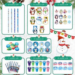 O conjunto de adesivos de Natal, apontador de lápis e borrachas é de 24 de cada tipo, e você pode embalá-los separadamente como presentes de sala de aula para 24 crianças.