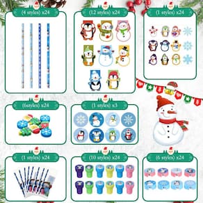 O conjunto de adesivos de Natal, apontador de lápis e borrachas é de 24 de cada tipo, e você pode embalá-los separadamente como presentes de sala de aula para 24 crianças.