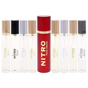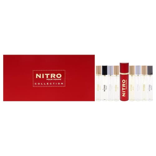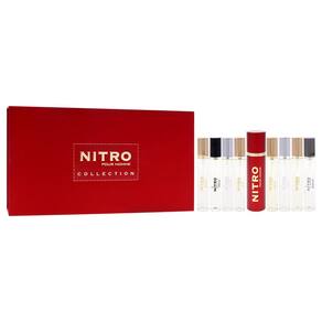 Coleção Nitro da Dumont para homens — Mini conjunto de 9 peças: 8 frascos EDP de 0,34 onças (preto, verde, intenso, platina, vermelho, branco, azul, Nitro Pour Homme) + estojo de spray de viagem