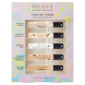 - O conjunto de teste de spray de perfume Take Me There inclui as 5 fragrâncias mais vendidas da Pacifica em Dream Moon, Silver Moon, Indian Coconut Nectar, Island Vanilla e Beach Day.