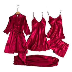 Descrição: Características: jogo de 5 pijamas sexy para mulher com painéis de embalagem acetinados, conjunto de pijama de casamento, pijama de noite, tamanho: S-2XL Cores: vinho vermelho, cinza, azul marinho, preto e rosa. Material: poliéster O pacote inclui: conjunto de pijama. Instruções de cuidado: lavar à mão. Nota: você pode ter um erro de 1 a 3 cm devido à medição manual.