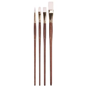 Conjunto De Pinceis Misto Longo Sintéticos Sinoart Com 4 Unidades Conjunto de Pincéis Sinoart composto por 4 pincéis de cerda sintética branca e cabo longo de madeira, indicado para diversas técnicas de pintura artística, como pintura em tela, aquarela, pintura em madeira, cerâmica entre outras técnicas. Sua cerda sintética foi especialmente elaborada para permitir o uso com tinta a base de água e base solvente. Conjunto composto pelos seguintes pincéis: 1 Formato chato n°81, 1 Formato chato n°121, 1 Formato redondo n°61, 1 Formato língua de gato n°6 Medidas aproximadas do produto - Comprimento: 34 cm - Altura: 1 cm - Largura: 7 cm - Peso: 60 g Ean: 6924309022157