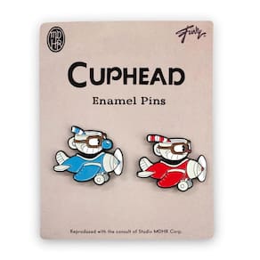 - Design atraente. Este conjunto de pinos esmaltados é vermelho e azul e apresenta Cuphead e Mugman voando em aviões.