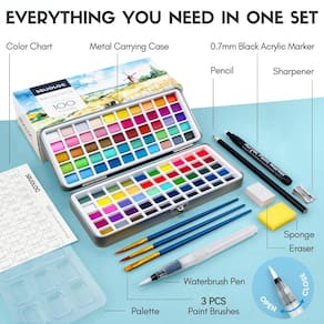 Conjunto de tinta aquarela tudo em um: 100 blocos de cores vivas com estojo de metal portátil para viagem (incluindo: 1 caneta acrílica preta, 1 caneta pincel de aquarela, 3 pincéis, 1 caneta de desenho, 1 apontador de lápis, 1 borracha, 1 esponja, 1 tabela de cores, 1 paleta, 1 bolsa de estação, 8 papel aquarela). Tudo o que você precisa está incluído neste mini conjunto de aquarela. para que você possa criar qualquer tempo, seja viajando ou em casa Conjunto de tinta aquarela de alta qualidade: 54 metálicos + 40 regulares + 6 fluorescentes. As cores são feitas de pigmentos de alta qualidade que são solúveis, fáceis de misturar e têm bom desempenho criativo. Dê vida à sua arte em aquarela. Não tóxico e seguro. Os conjuntos de tintas guache SRUOLOC não são tóxicos. Cada marcador permanente espesso atende aos padrões de segurança ASTM d-4236 e EN-71. Embalagem para presentes: simples e elegante estojo de viagem portátil e bolsa de armazenamento, que pode armazenar todos os itens e também pode ser usada para bricolage, sinta-se à vontade para criar na bolsa e na capa Versátil para todos os artistas: perfeito para artistas em todas as etapas, comece sua jornada criativa com um conjunto de tinta de aquarela SRUOLOC - Conjunto de tinta aquarela tudo em um: 100 blocos de cores vivas com estojo de metal portátil para viagem (incluindo: 1 caneta acrílica preta, 1 caneta pincel de aquarela, 3 pincéis, 1 caneta de desenho, 1 apontador de lápis, 1 borracha, 1 esponja, 1 tabela de cores, 1 paleta, 1 bolsa de stroage, 8 papel aquarela). Tudo o que você precisa está incluído nesta mini aquarela. conjunto, para que você possa criar a qualquer momento, seja viajando ou em casa - Conjunto de tinta aquarela de alta qualidade: 54 metálicos + 40 regulares + 6 fluorescentes. As cores são feitas de pigmentos de alta qualidade que são solúveis, fáceis de misturar e têm bom desempenho criativo. Dê vida à sua arte em aquarela - Não tóxico e seguro: os conjuntos de tinta guache SRUOLOC não são tóxicos, mas atendem aos padrões de segurança ASTM d-4236 e EN-71 - Embalagem para presente: Estojo de viagem portátil simples e elegante e bolsa de armazenamento, que pode armazenar todos os itens e também pode ser utilizado para bricolage, sinta-se à vontade para criar na capa - Versátil para todos os artistas: perfeito para artistas em todas as etapas, comece sua jornada criativa com o conjunto de tinta SRUOLOC aquarela