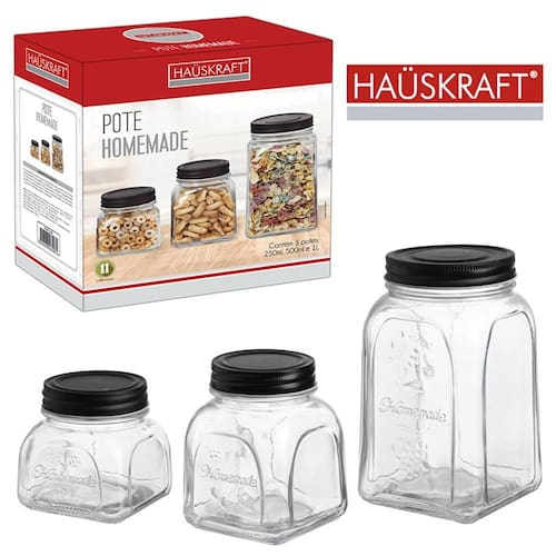Conjunto de pote de vidro quadrado homemade com tampa hermetica de metal preto hauskraft 3 pecas Ean: 7896980462081 Validade: indeterminada Capacidade: 250ml, 500ml e 1l Tamanho aproximado: 1 pote - 8,4x8,2cm 1 pote - 11,5x8,9cm 1 pote - 16,9x9,9cm Tamanho aproximado da caixa: a:21xl:20xp:10,5cm Peso aproximado: 1315g Tipo de produto: conjunto de pote quadrado homemade com tampa hermetica hauskraft 3 pecas Cor: transparente com tampa preto Composição: vidro e metal