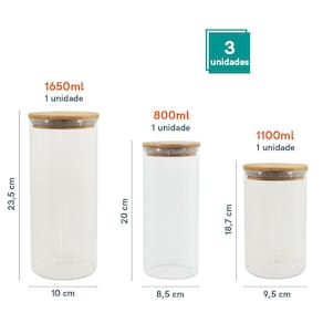 Esse é o KIT de 3 potes de vidro hermético redondos para mantimentos com tampa de bambu da OIKOS.
