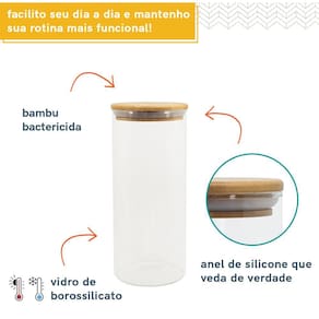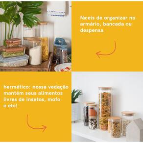 Não julgue pelas aparências, ele não é só um KIT bonito: com a combinação da vedação de silicone e o bambu antibactericida, esse KIT se torna um verdadeiro mestre na conservação de alimentos! E não é só de comida que vivem esses potes: além de tempero, açúcar e sal, neles também cabem purpurina, algodão, moedas, grãos, clipes, grampos, elásticos e outras pequenices que você quiser guardar - isso que é versatilidade.