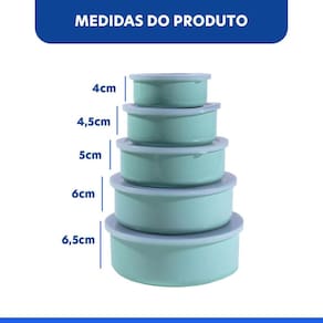 Dimensões e Capacidades: Pote 1: 4 cm x 10 cm A x D , capacidade 250 ml, peso 35g Pote 2: 4,5 cm x 12 cm A x D , capacidade 450 ml, peso 50g Pote 3: 5 cm x 14 cm A x D , capacidade 700 ml, peso 60g Pote 4: 6 cm x 16 cm A x D , capacidade 1 L, peso 80g Pote 5: 6,5 cm x 18 cm A x D , capacidade 1,4 L, peso 99g