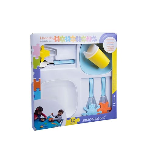 Agora seu filho terá um conjunto só para ele com um cumbuca, prato de sobremesa, colher, garfo, faca e copinho