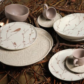 A coleção Bio, feita em Cerâmica Stoneware, um material inovador e sustentável, onde a combinação das melhores matérias primas naturais, unido a um processo único de queima e acabamento manual, entregam um produto com características superiores em termos de qualidade e resistência. Podendo ser levados à geladeira, micro-ondas, lava-louças e forno convencional. A leveza das peças fica por conta dos tons claros e neutro já a delicadeza se da por conta da decoração dos passarinhos.