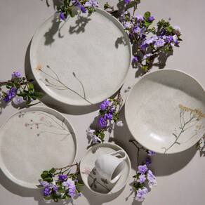 A coleção Bio, feita em Cerâmica Stoneware, um material inovador e sustentável, onde a combinação das melhores matérias primas naturais, unido a um processo único de queima e acabamento manual, entregam um produto com características superiores em termos de qualidade e resistência. Podendo ser levados à geladeira, micro-ondas, lava-louças e forno convencional. O charme da mesa fica por conta dos tons suaves de azul, flores e pássaros.