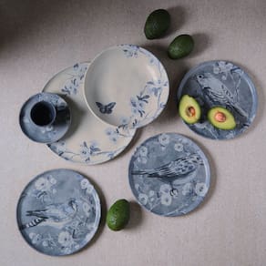 A coleção Bio, feita em Cerâmica Stoneware, um material inovador e sustentável, onde a combinação das melhores matérias primas naturais, unido a um processo único de queima e acabamento manual, entregam um produto com características superiores em termos de qualidade e resistência. Podendo ser levados à geladeira, micro-ondas, lava-louças e forno convencional. O charme da mesa fica por conta dos tons suaves de azul, flores e pássaros.