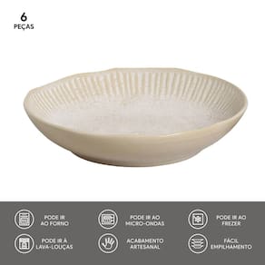 Adicione Sofisticação à Mesa O Conjunto de Pratos Fundos Porto Brasil, traz um toque de delicadeza a decoração da sua mesa. Com 6 peças de 22,5cm de circunferência cada, é a escolha perfeita para servir as suas refeições preferidas. A linha Latte apresenta design clássico e atemporal, com cores claras e detalhes de linhas nas bordas das peças.