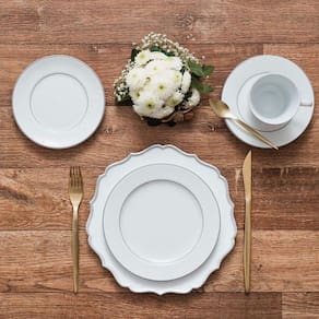 Conjunto de Pratos Rasos 06 Peças Martha Schmidt Menos é mais, a decoração Martha parte deste princípio para encantar sua mesa. Apesar do minimalismo aparente, os detalhes podem ser vistos mais de perto, nos desenhos de renda emoldurados por filetes cinza. Essa decoração é a aposta perfeita para uma mesa requintada e moderna! Conjunto de Pratos Rasos 06 Peças Martha Schmidt - Incluso 6 Pratos Rasos - 27 cm Conjunto de Pratos Rasos 06 Peças Martha Schmidt - Informações Uso: Resistente a micro-ondas, resistente a lava-louças Material: Porcelana Formato: Redondo Decoração: Renda nas bordas com filete cinza Cor: Branco