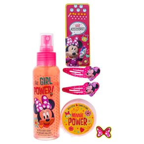 Disney Minnie Mouse da Disney para crianças — Conjunto de presente de 5 peças de spray corporal de 3,4 onças, espumante de banho, gemas para cabelo, anel, clipes, 5 unidades