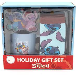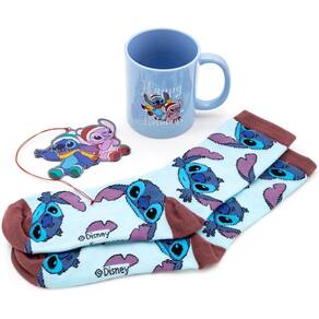 Escreva-me uma descrição para um conjunto de presentes Lilo And Stitch. O conjunto de presentes inclui uma caneca de 12 onças, meias redondas e um enfeite de Natal. A caneca tem um design detalhado do personagem Stitch And Angel Happy Holiday, enquanto as meias têm um padrão facial de personagem Stitch em toda parte. O enfeite de Natal também tem um design maravilhoso de Stitch And Angel. Isso é perfeito para fãs dos magníficos filmes da Disney. As meias são feitas de 98% poliéster macio e elástico e 2% elastano.