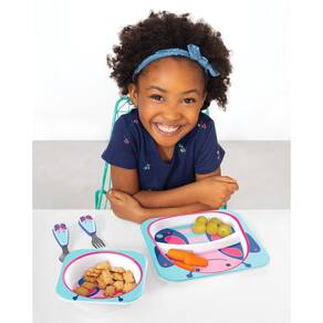 - Feito de melamina durável, o prato dividido e a tigela são perfeitos para cereais, massas e muito mais! O garfo e a colher apresentam alças laterais macias que são fáceis para os pequenos segurarem — assim como uma criança grande