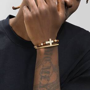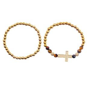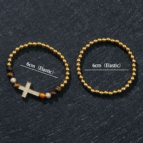 Tamanho: Diâmetro 8 cm, pulseira 6 cm Peso: 30 g Material: conjunto combinado de 2 peças em cobre/zircão — Inclui uma combinação elegante de uma pulseira de contas de ouro liso e uma pulseira cruzada adornada com detalhes em zircão e olhos de tigre. Cruz de zircão cintilante — apresenta uma impressionante peça central em cruz de zircão pavimentado que adiciona um toque luxuoso e simboliza estilo e força. Miçangas de cobre premium — Feitas com contas de cobre polidas douradas para uma aparência elegante e sofisticada que resiste ao desbotamento e manchas. Ajuste elástico e confortável — Construído com cordão elástico para caber facilmente na maioria dos tamanhos de pulso (diâmetro da pulseira de aproximadamente 6 cm; conjunto geral de 8 cm), sem necessidade de fecho. Escolha de moda versátil — perfeita para homens que buscam acessórios sofisticados para ocasiões casuais, noturnas ou formais, ou que adicionam luxo às roupas do dia a dia.