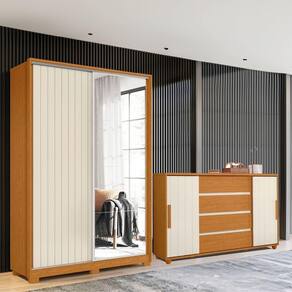 Conjunto De Quarto Guarda Roupas Com Espelho 2 Portas De Correr E Cômoda Hera Flex Madeirado/off Whi Madeir/off