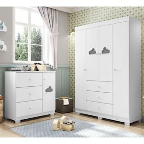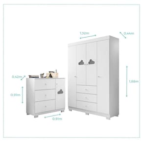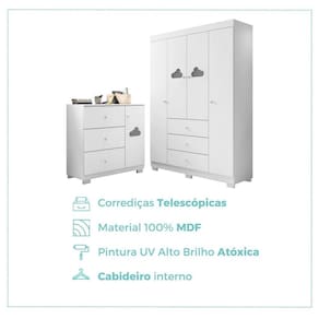 Este lindo Dormitório Ane vai encantar ainda mais o seu ambiente. Projetado para acompanhar todo o desenvolvimento infantil, dispõe de um Roupeiro com 04 Portas e 03 Gavetas além de uma Cômoda com 01 Porta e 03 Gavetas. Produzido 100% em MDF e pintura UV Alto Brilho atóxica proporcionando mais qualidade e durabilidade ao produto. As Corrediças Telescópicas promovem um deslizamento suave, silencioso e muito mais resistente. Há também cabideiros inclusos que favorecem a organização e otimizam o espaço. É sem dúvidas o Conjunto Perfeito para compor o ambiente mais importante do seu bebê com conforto, segurança e delicadeza. Altura do Conjunto: 188 cm Ambiente Principal: Quarto Infantil Complexidade da Montagem: Média: pode ser montado por mais de uma pessoa e/ou necessite de maior conhecimento para montagem Cor: Branco Cor do Produto: Branco Escala de Brilho: Brilhante Manual de Especificação Técnica: https://cdn2.madeiramadeira.com.br/atributo/phoenix-baby/1280344-gr-ane-4-pta.pdf Manual de Montagem e Instalação: https://cdn2.madeiramadeira.com.br/atributo/phoenix-baby/1280341-gr-ane-4-pta.pdf Material Principal: MDF Medida de Cada Item: Guarda Roupa: 188cm x 132cm x 44cm Cômoda: 91cm x 91cm x 42cm Necessita Montagem: Sim Origem do Produto: Nacional Peso: 101.8 Pintura Atóxica: Sim Recomendações de Uso, Manutenção e Limpeza: Pano seco Sistema de Montagem: Parafusos Suporta Até (kg): 50