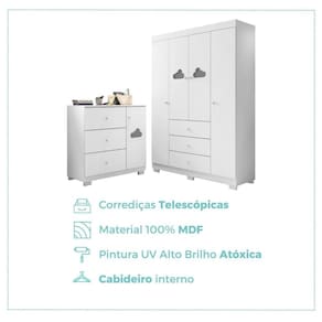 Conjunto de Quarto Infantil Guarda-roupas e Cômoda Ane Phoenix Baby Branco. Este lindo Dormitório Ane vai encantar ainda mais o seu ambiente. Projetado para acompanhar todo o desenvolvimento infantil, dispõe de um Roupeiro com 04 Portas e 03 Gavetas além de uma Cômoda com 01 Porta e 03 Gavetas. Produzido 100% em MDF e pintura UV Alto Brilho atóxica proporcionando mais qualidade e durabilidade ao produto. As Corrediças Telescópicas promovem um deslizamento suave, silencioso e muito mais resistente. Há também cabideiros inclusos que favorecem a organização e otimizam o espaço. É sem dúvidas o Conjunto Perfeito para compor o ambiente mais importante do seu bebê com conforto, segurança e delicadeza. Ean: 7909903287118
