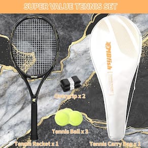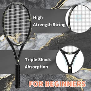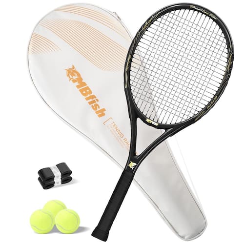 Raquete de tênis – Conjunto de super valor com cordas resilientes, alça confortável - Conjunto de raquete de tênis: esta raquete de tênis MBFISH vem com 3 bolas de tênis, 2 overgrips e uma bolsa de tênis, dando a você tudo o que você precisa para começar a jogar imediatamente. - Comprimento ideal: com um comprimento padrão de 68,5 cm, esta raquete é adequada para jogadores adultos de todos os níveis de habilidade, permitindo velocidade e controle ideais de balanço. - Cordas resilientes: o design estrutural integrado desta raquete de tênis garante que as cordas estejam firmemente presas, proporcionando excelente desgaste e minimizando o risco de quebra da corda. - Alça confortável: o design ergonômico da alça oferece uma aderência confortável e firme para melhor controle e manobrabilidade durante suas partidas de tênis. - Raquete de tênis de estrutura integrada: o design inovador de estrutura integrada desta raquete melhora sua estabilidade geral e desempenho, proporcionando tiros poderosos e precisos.