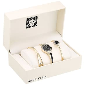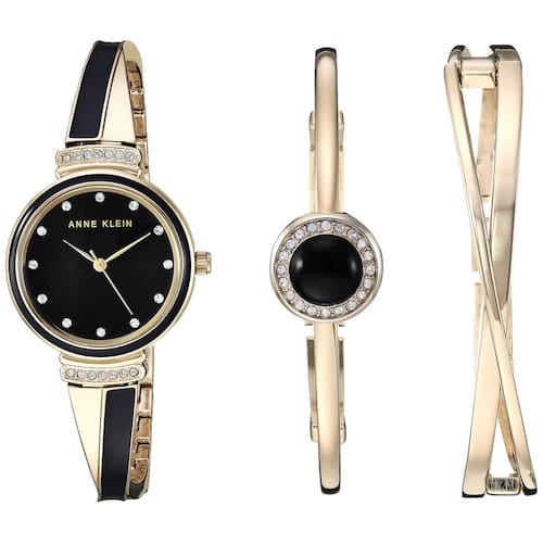 Anne Klein Relógio feminino premium com detalhes de cristal e conjunto de pulseira, Dourado/preto, AK/3292BKST - Conjunto de argolas com 14 cristais premium; mostrador preto brilhante com ponteiros dourados e marcadores de cristal premium; pulseira dourada e preta em forma de X com elos de extremidade ajustáveis; fecho e extensor de joias - O conjunto inclui duas pulseiras douradas: uma em forma de x e outra acentuada com cristais premium e centro de esmalte preto - Movimento de quartzo japonês - Diâmetro da caixa: 26 mm - Resistente à água até 30 m: em geral, resiste a respingos ou breve imersão em água, mas não é adequado para nadar ou tomar banho