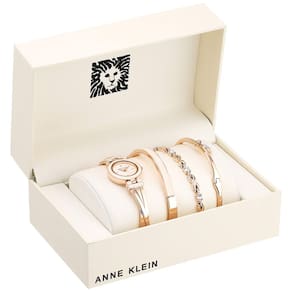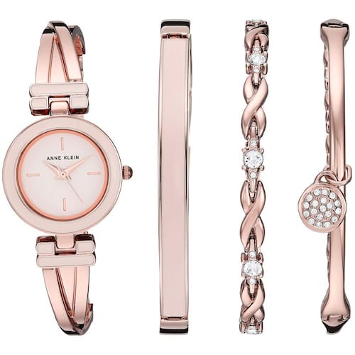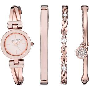 Conjunto de relógio feminino Anne Klein e pulseira premium com detalhes em cristal — moldura preenchida em rosa blush; lente de cristal mineral; mostrador rosa brilhante com ponteiros e marcadores em ouro rosa; pulseira em forma de x em tom de ouro rosa com elos ajustáveis; fecho e extensor de joias — o conjunto inclui três pulseiras em tom de ouro rosa; uma pulseira com enchimento de esmalte rosa blush, uma premium com detalhes em cristal x link pulseira e uma pulseira com pingente pendurado incrustadas com cristais premium - Movimento de quartzo japonês - Diâmetro da caixa: 24,5 mm - Resistente à água até 30 m (100 pés): em geral, resiste a respingos ou breve imersão na água, mas não é adequado para nadar ou tomar banho